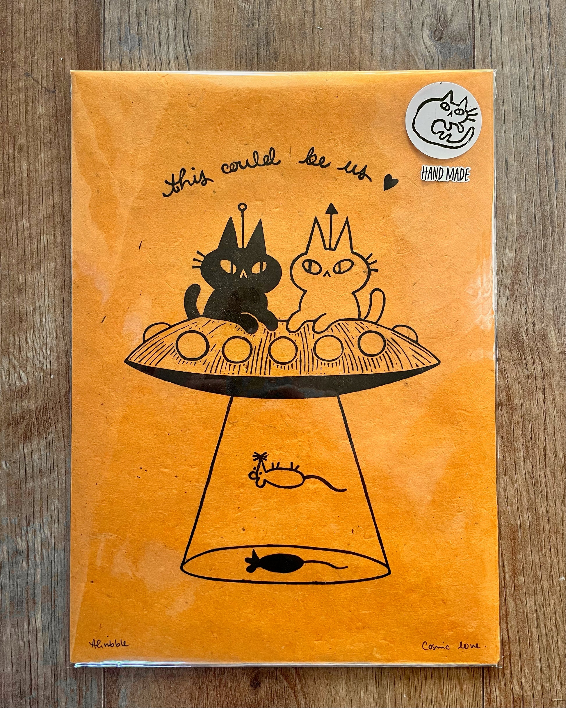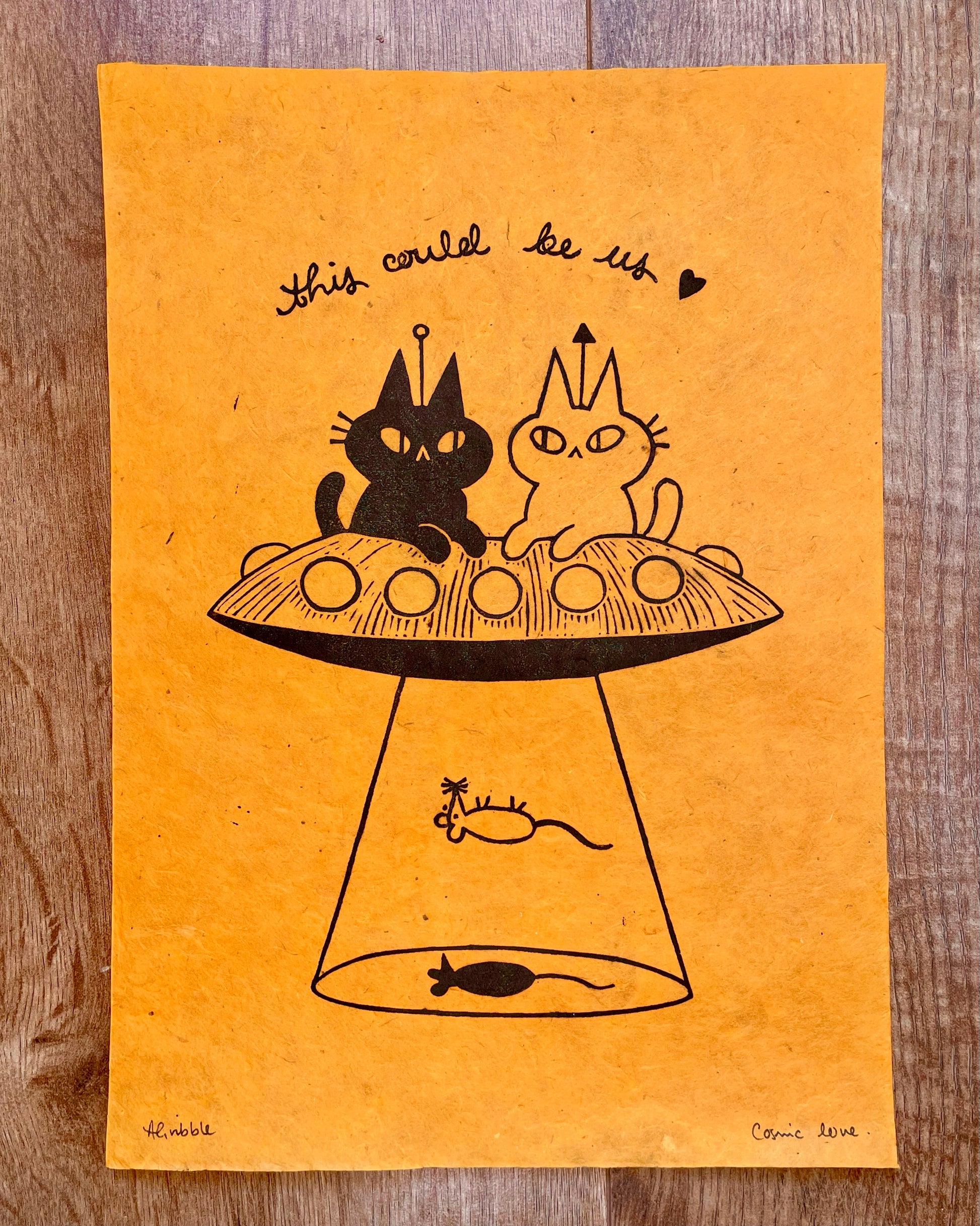 'Cosmic Love' is an original, hand-made linocut print which has been designed and printed in West Yorkshire by Alice Gribble.