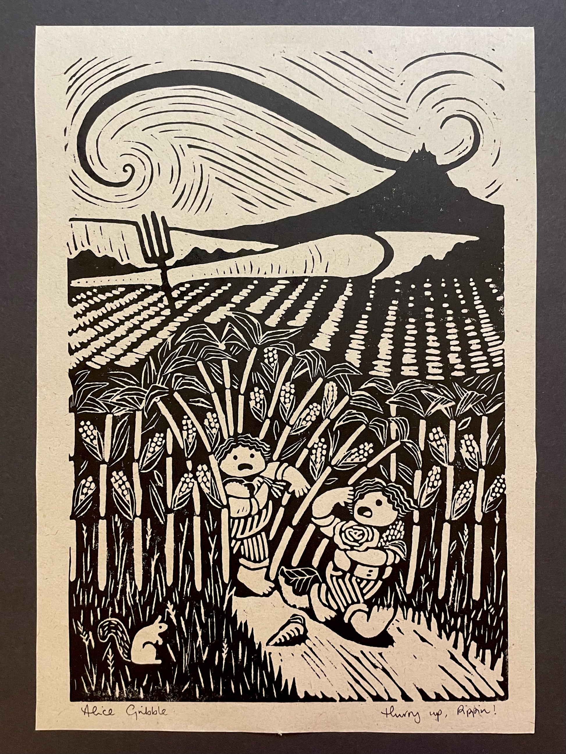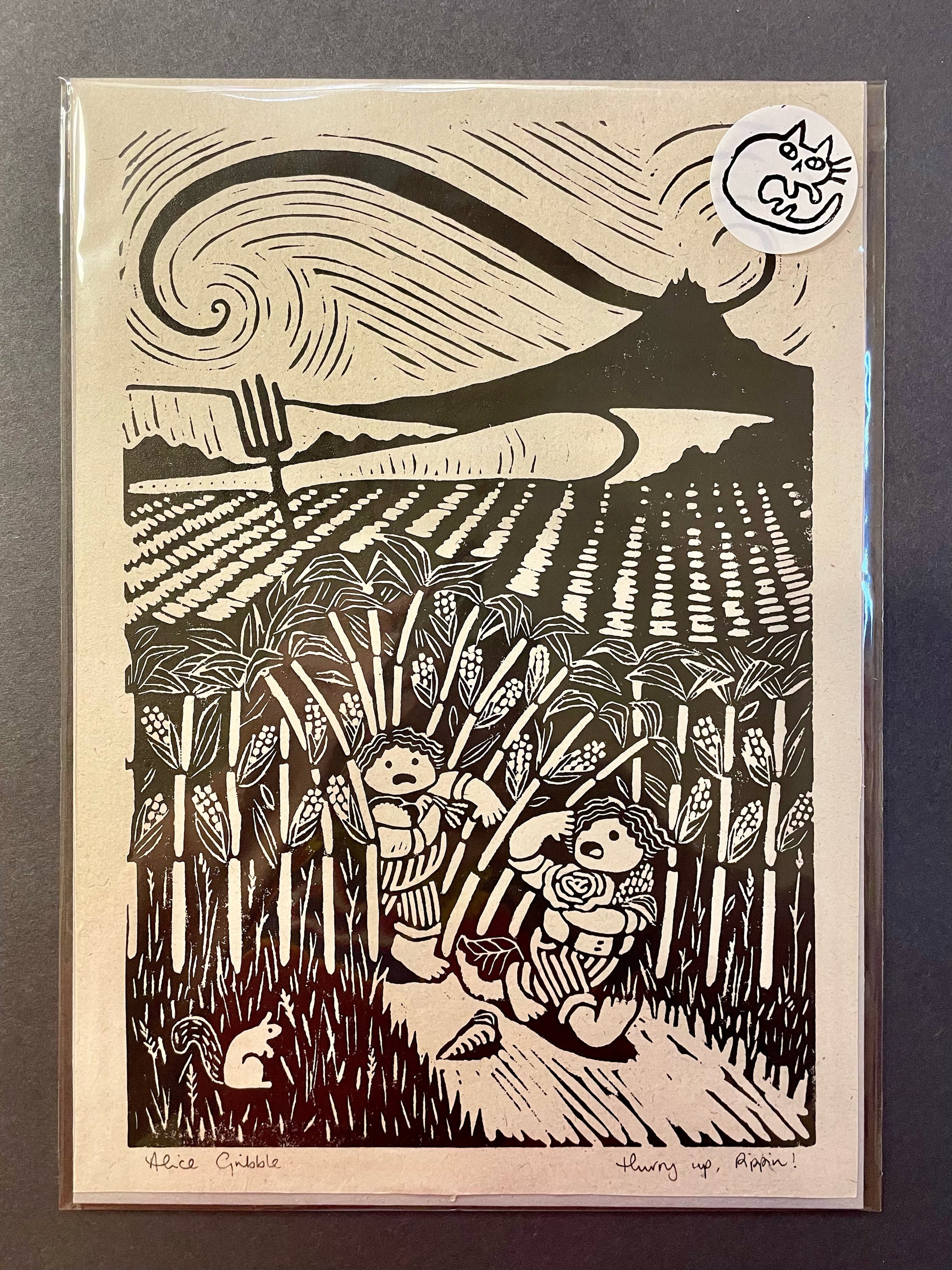 'Hurry up, Pippin!' is an original, hand-made linocut print which has been designed and printed in West Yorkshire by Alice Gribble.