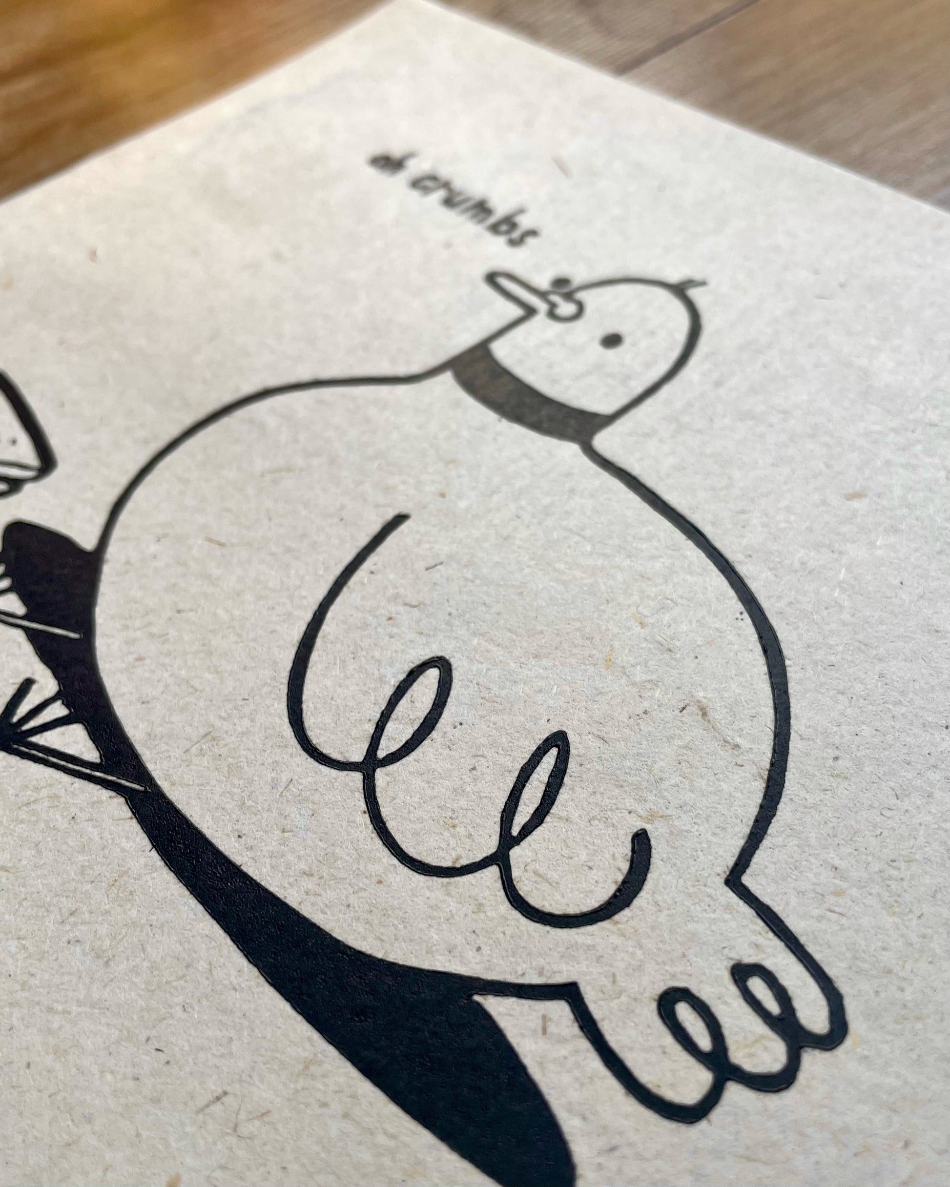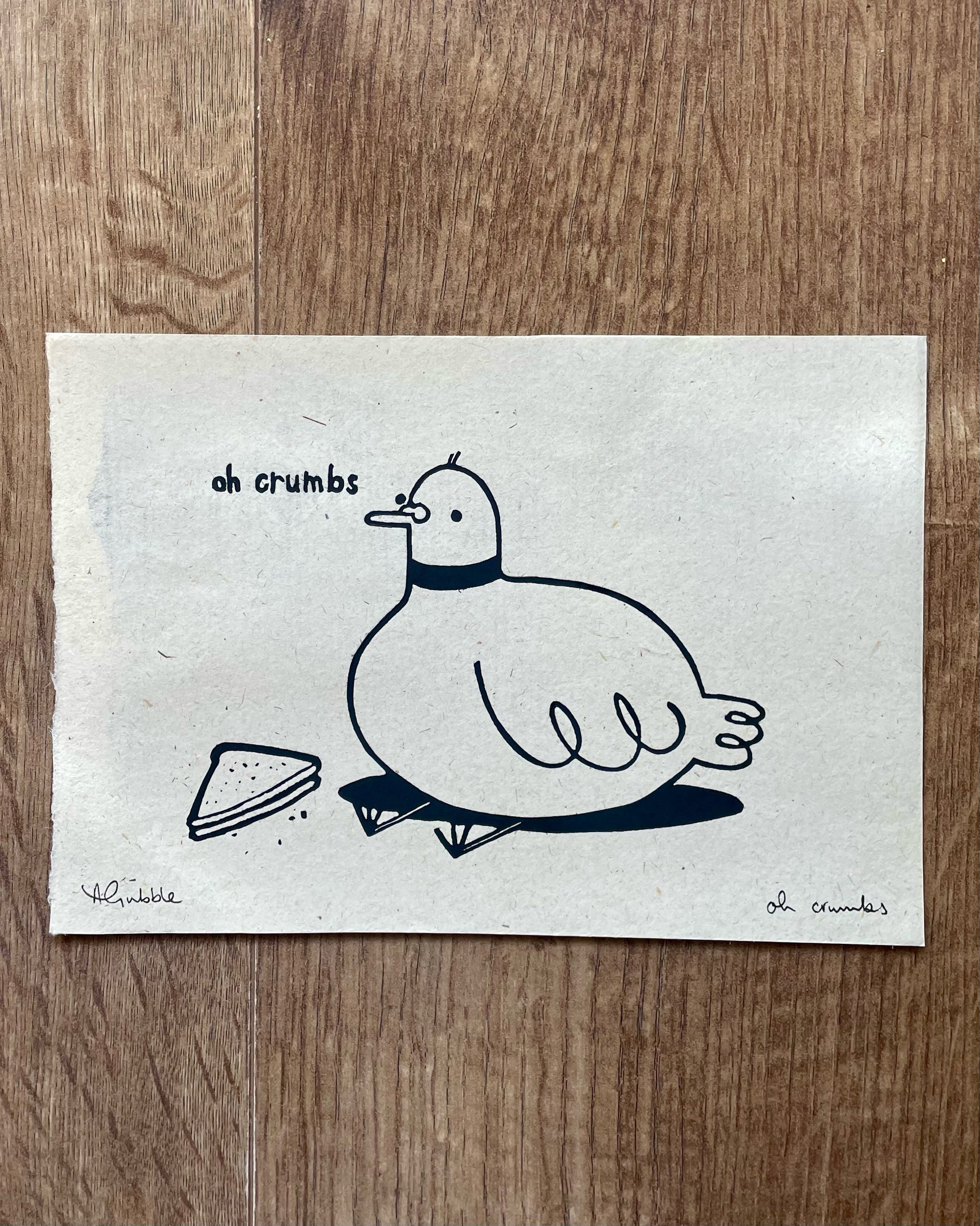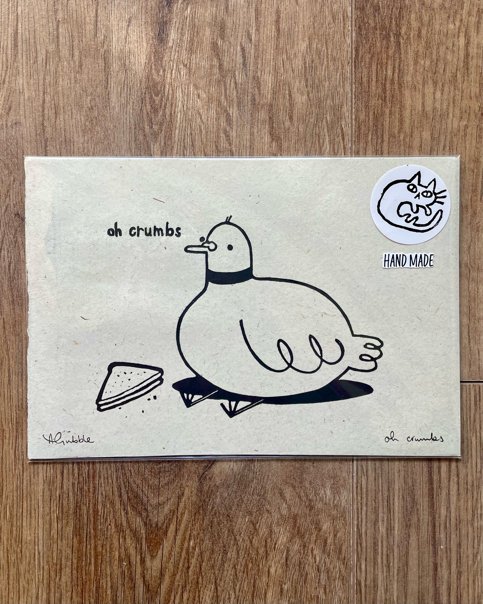 'Oh Crumbs' is an original, hand-made linocut print which has been designed and printed in West Yorkshire by Alice Gribble.