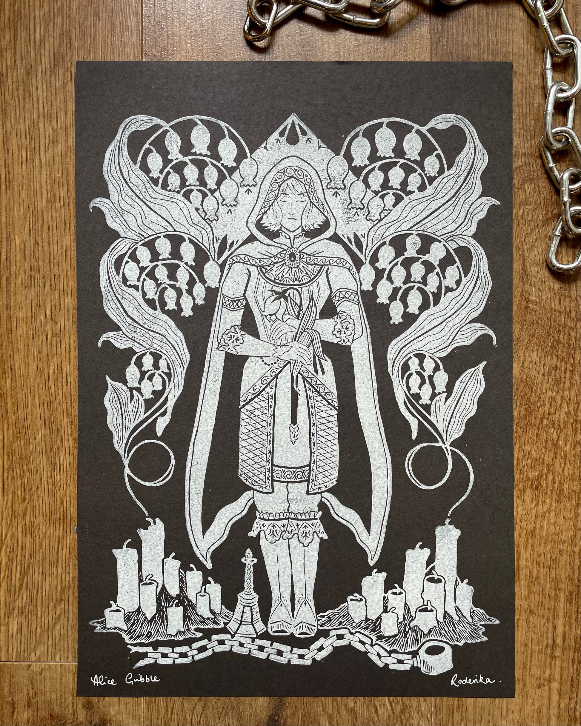 'Roderika' is an original, hand-made linocut print which has been designed and printed in West Yorkshire by Alice Gribble. It is a fan-art piece based on the character Roderika featured in the FromSoftware videogame Elden Ring.