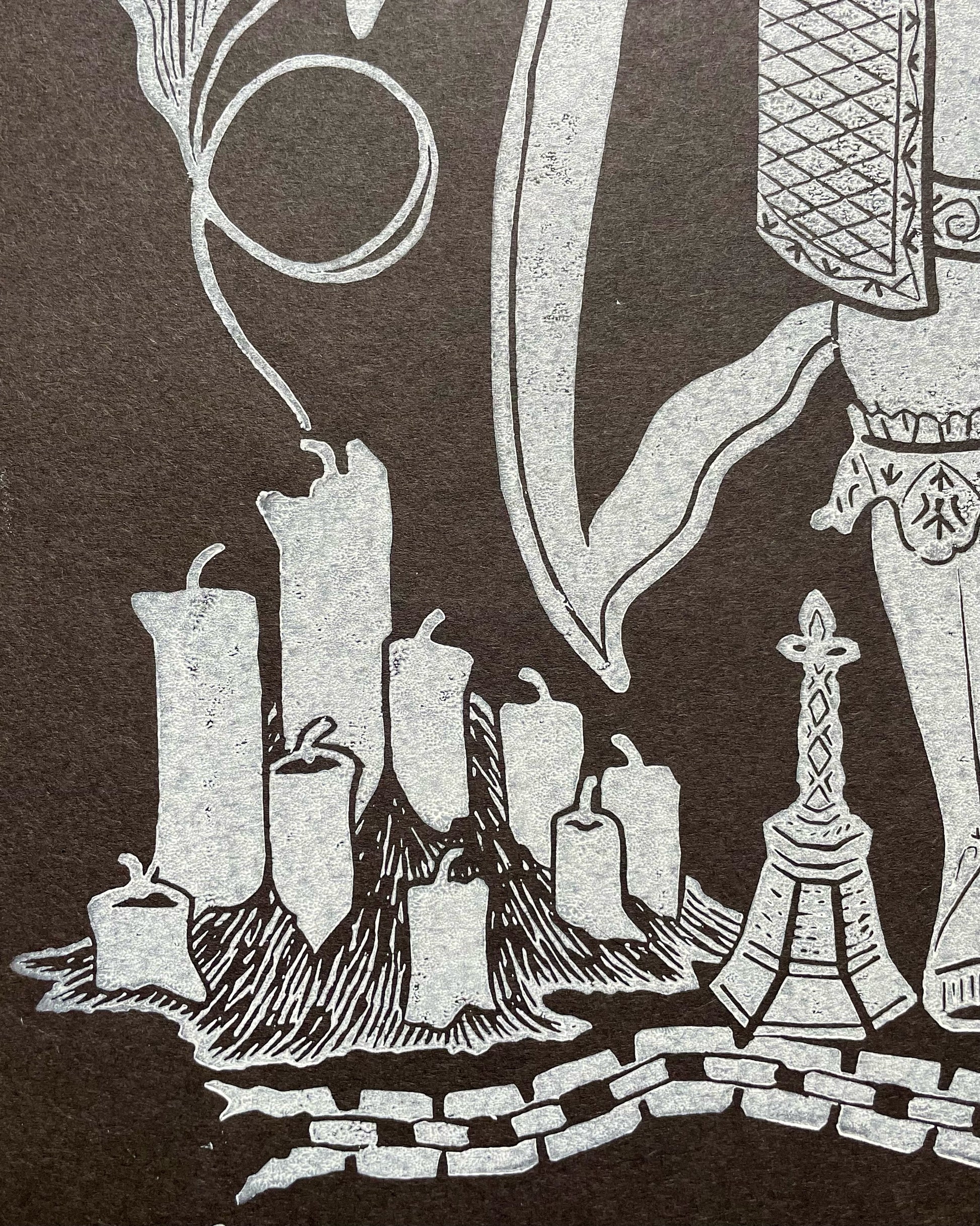 White Cranfield Caligo relief printing ink on black sugar paper.