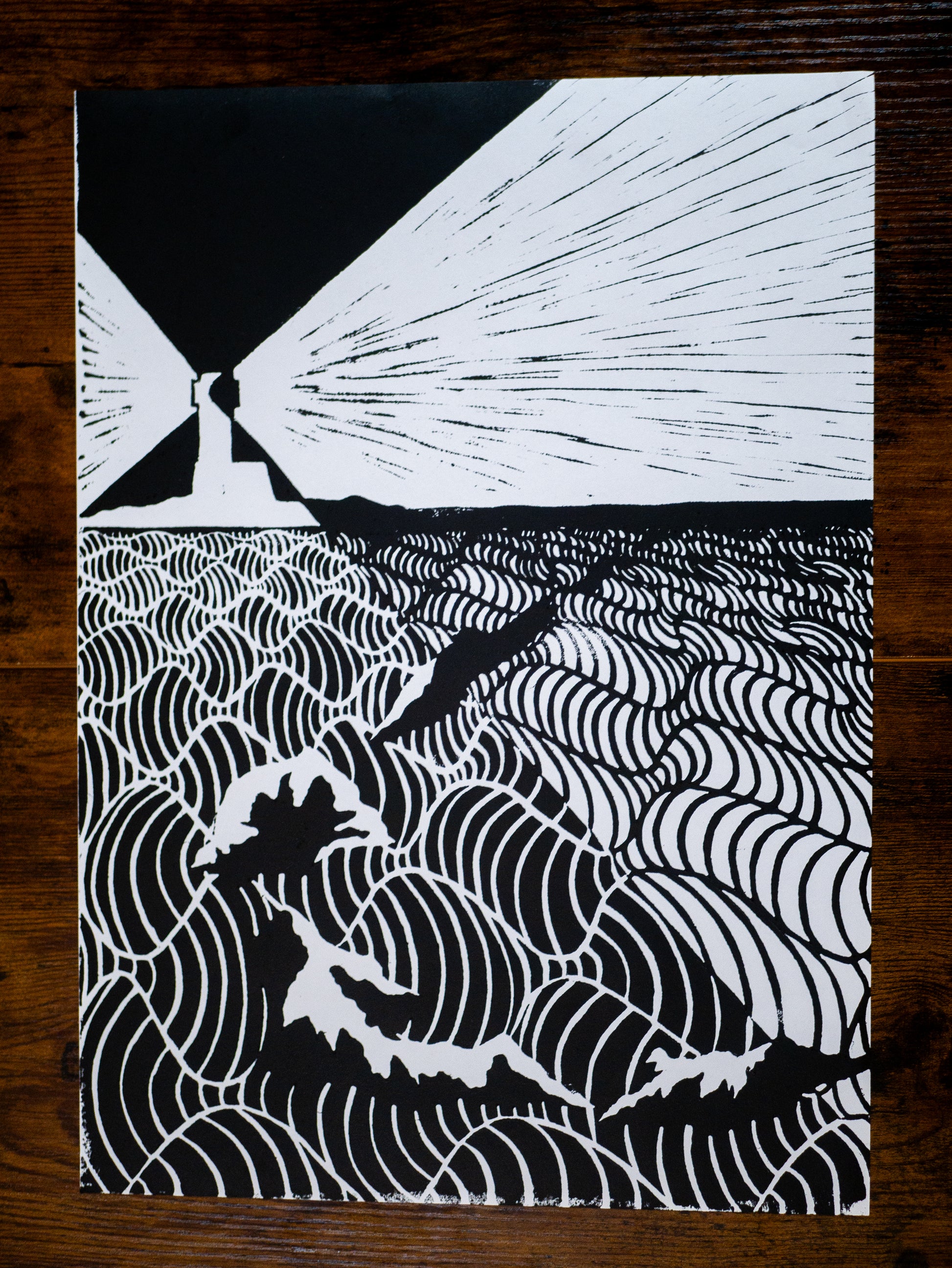 'Treacherous Waters' is an original, hand-made linocut print which has been designed and printed in West Yorkshire by Alice Gribble.