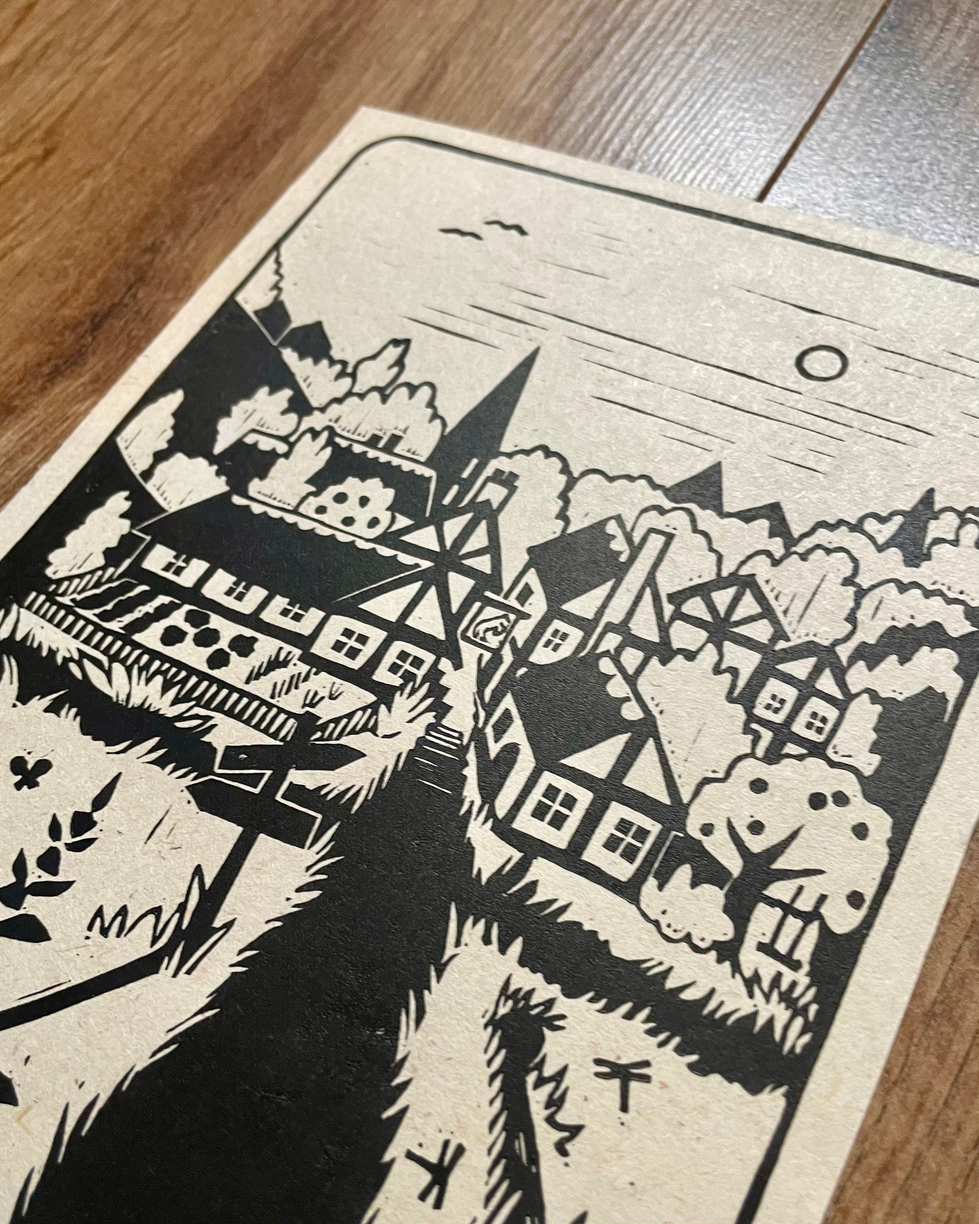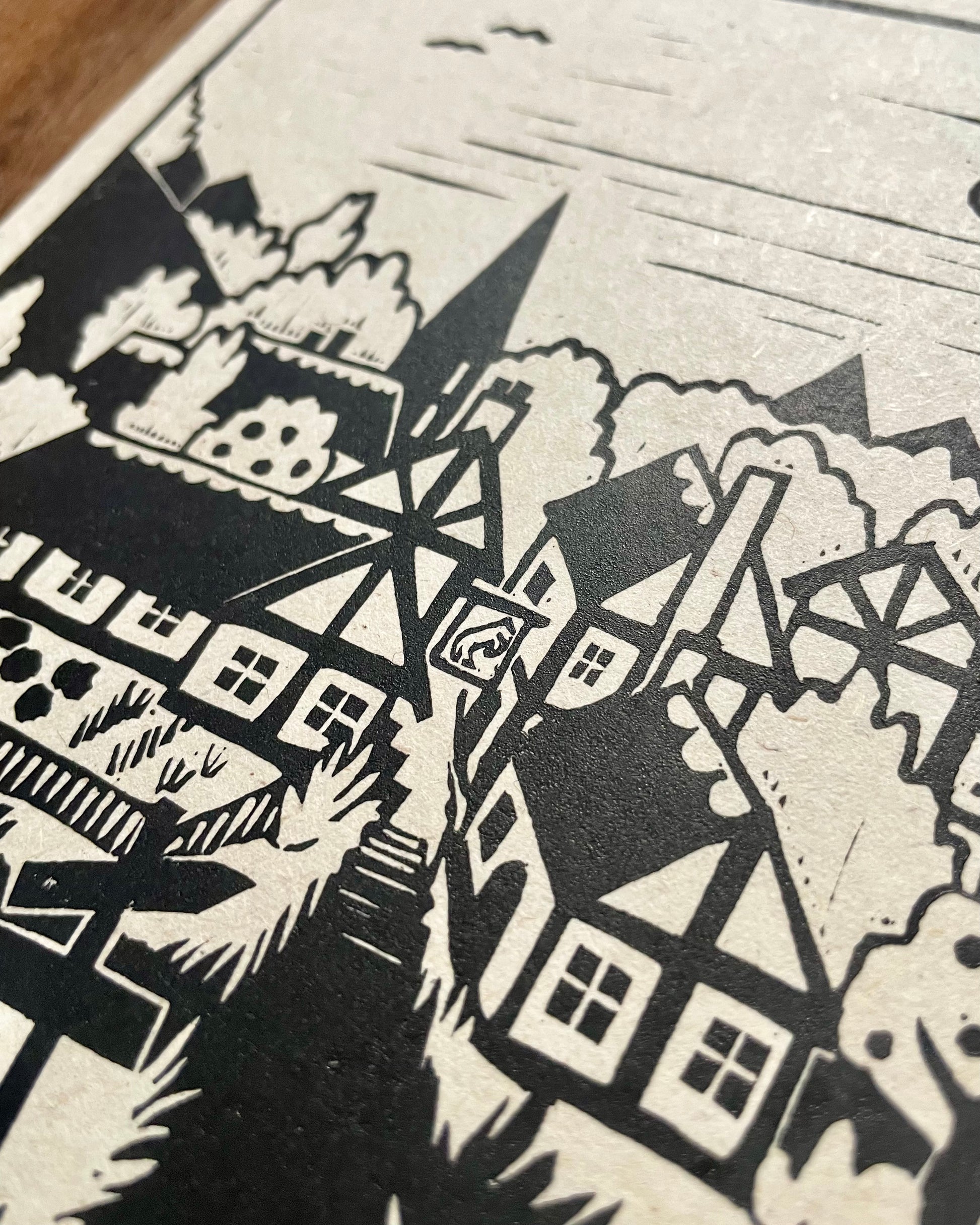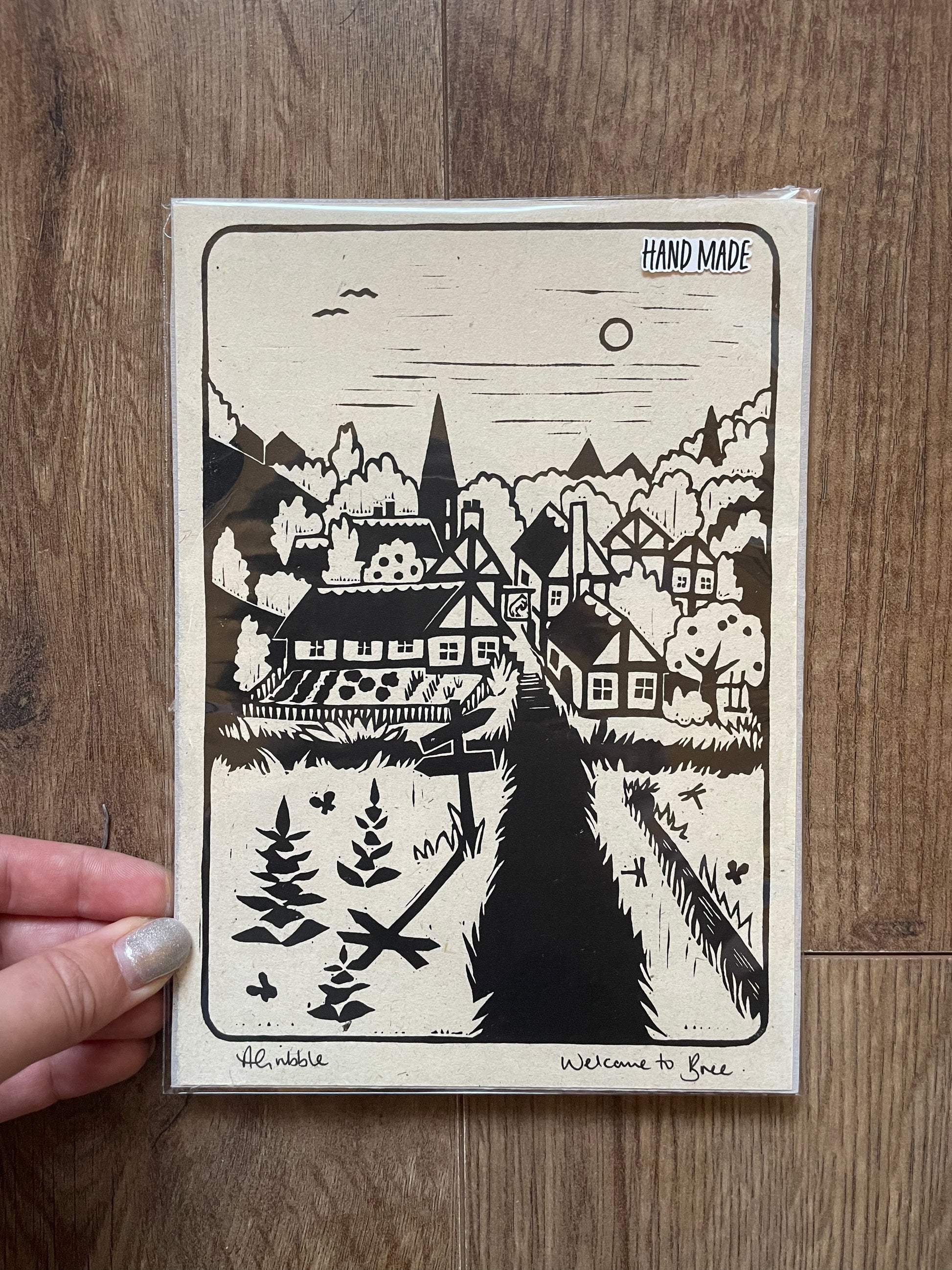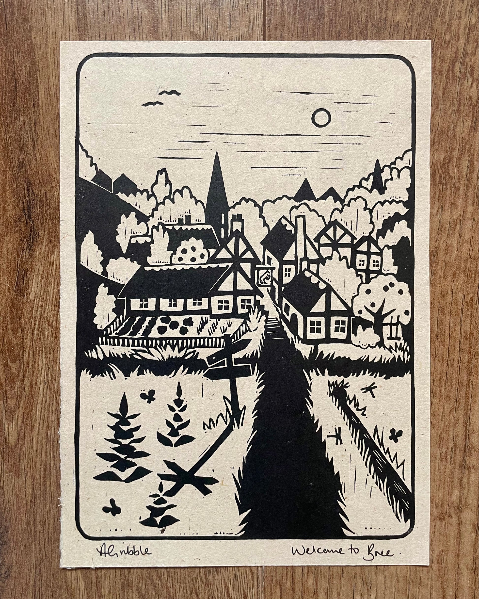 'Welcome to Bree' is an original, hand-made linocut print which has been designed and printed in West Yorkshire by Alice Gribble. It is a reference to the fictional town of Bree featured in JRR Tolkien's 'The Lord of The Rings'. This print was made for Tolktober 2025, an art project run by Matt Bailey of Rogue Print Co, and can be seen in the third Tolktober zine purchasable here.